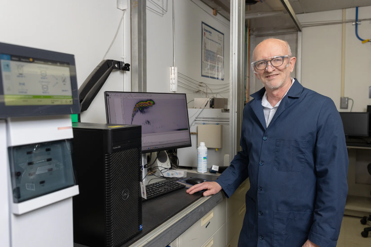 Robert McCormick, a senior research fellow in fuels and combustion science, stands next to a 2D gas chromatograph coupled to a time-of-flight mass spectrometer (GCxGC-TOF-MS) at NLR. The GCxGC-TOF-MS is used for detailed chemical analysis of complex mixtures including diesel and jet fuels. Photo by Joe DelNero, National Laboratory of the Rockies