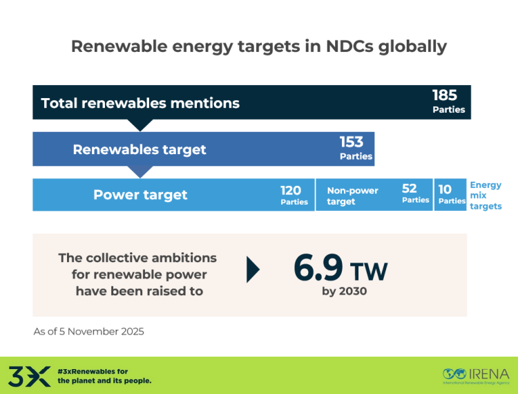 To reach the global total of 11.2 terawatts (TW) aligned with the UAE Consensus tripling renewable power capacity goal 2030, NDC targets collectively need to increase by more than 60%. The latest quantification of renewable energy capacity targets in NDCs submitted as of 5 November 2025 finds that existing targets aim to collectively increase renewable energy capacity to approximately 6.9 TW by 2030, from 4.4 TW in 2024. With less than five years remaining for implementation, urgent and effective action on the ground, accompanied by increased investments in renewable energy, is crucial.