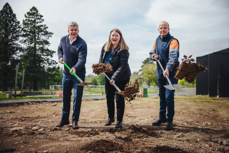 Monaro MP Steve Whan, NSW Agriculture Minister Tara Moriarty and Snowy Hydro General Manager of Water, Environment and Lands General Manager Charlie Litchfield break ground at the new trout facility.