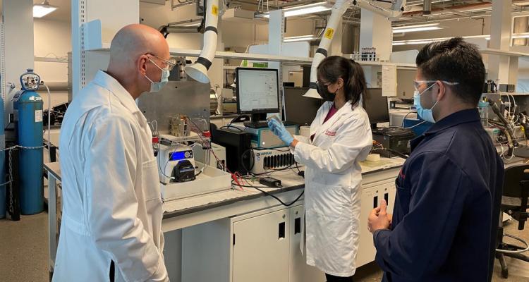 Ted Roberts, left, and Ashutosh Singh, right, look on as PhD student Maedeh Pahelevaninezhad holds an electrode at their laboratory. Courtesy Ted Roberts