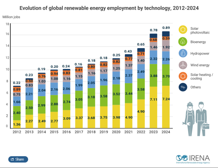 Global renewable energy employment hit 16.6 million jobs in 2024, yet growth slowed to just 2.3% despite record capacity additions.