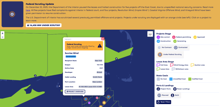 The Offshore Wind Power Hub presents accurate, detailed, and up-to-date information on offshore wind projects, lease areas, ports, and power landings. It shows the development stage of every project and lease area, including details on contracts, permits, and construction. A new filter identifies projects that the federal government has attempted to block by withdrawing permits, stopping construction, or requiring additional review. Projects under scrutiny are highlighted with an orange hash. Clicking on the project opens a summary of its current status with the federal government.